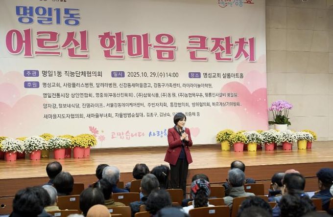 [ 중앙뉴스미디어 ] 서울 강동구 명일1동은 지난 10월 29일 명성교회 샬롬아트홀에서 관내 어르신 250여 명을 모시고, ‘명일1동 어르신 한마음 큰잔치’를 성황리에 개최했다고 밝혔다.