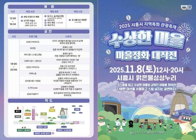 [ 중앙뉴스미디어 ] 시흥시는 2025년 시흥시 지역특화 관광축제 지원사업 선정 축제인 ‘수상한 마을 마을정화대작전’을 오는 11월 8일 정왕동 맑은물상상누리 일원에서 개최한다. 이번 축제는 시흥시 청년예술연합회가 주관한다.