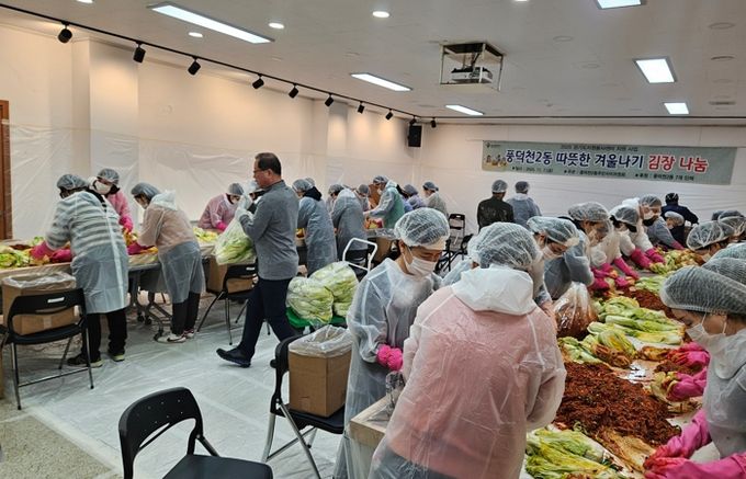 풍덕천2동 주민자치위원회는 지난 7일 통장협의회, 체육회, 새마을지도자협의회, 새마을부녀회, 노인회, 청소년지도위원회, 지역사회보장협의체 등 단체 회원들과 따뜻한 겨울나기 김장나눔’ 행사를 했다.