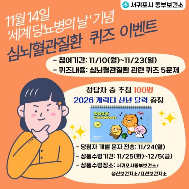 [ 중앙뉴스미디어 ] 서귀포시 동부보건소는 2025년 ‘세계 당뇨병의 날’을 기념하여 11월 10일부터 11월 23일까지 14일간 모바일 앱 ‘워크온’을 활용한 심뇌혈관질환 퀴즈 이벤트를 운영한다.