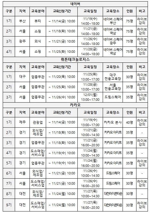 국내의 대표적인 인공지능(AI) 기업인 네이버, 뤼튼테크놀로지스, 카카오(이상 가나다 순)가 교육기관으로 참여하며, 각 기관이 직접 기획한 교육과정(커리큘럼)에 따라 현장 교육과 온라인 교육이 함께 진행될 예정이다.