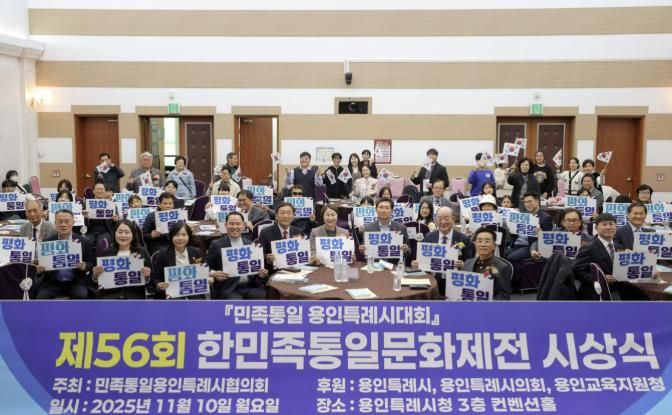 [ 중앙뉴스미디어 ] 용인특례시는 10일 시청 컨벤션홀에서 민족통일 용인특례시협의회 주관으로 ‘민족통일 용인특례시대회와 제56회 한민족통일문화제전 시상식’이 열렸다고 밝혔다.
