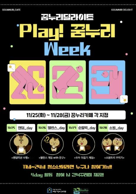 [ 중앙뉴스미디어 ] 의왕시청소년재단 산하 의왕시청소년수련관 꿈누리카페(▲고천점( 문화공원로 33), ▲내손점(복지로 109), ▲오전점(찬우물길 11), ▲백운밸리점(백운중앙로 74, 총 4개 지점))는 오는 11월 25일부터 28일까지 4일간 꿈누리딜라이트 『Play! 꿈누리 Week』를 진행한다고 밝혔다.