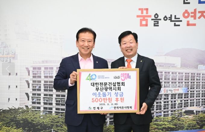[ 중앙뉴스미디어 ] 연제구는 11월 11일 대한전문건설협회 부산광역시회(회장 김형겸)로부터 이웃돕기 성금 500만원을 기탁 받았다. 기탁 받은 성금은 취약계층 지원을 위한 사업에 이용될 예정이다.