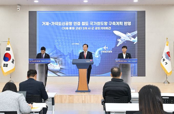 [ 중앙뉴스미디어 ] 거제시는 17일 오후 2시 거제시청 대회의실에서 통영시․고성군과 함께 ‘거제~가덕도신공항 연결철도’의 제5차 국가철도망 구축계획 반영을 촉구하는 공동 기자회견을 개최했다.