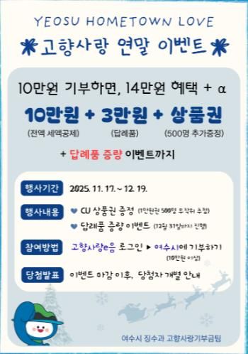 [ 중앙뉴스미디어 ] 여수시는 연말정산 시즌을 맞아 고향사랑기부 참여자에게 더 많은 혜택을 제공하기 위해 ‘고향사랑기부제 연말 이벤트’를 진행한다.
