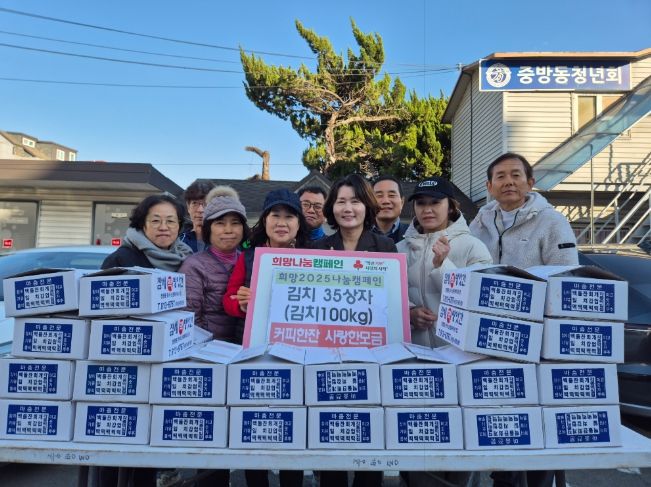 [ 중앙뉴스미디어 ] ‘커피 한 잔 사랑 한 모금(커사랑)’봉사단체(회장 민향심)은 18일 직접 담근 김장 김치 35상자(3kg들이)를 중방동행정복지센터에 기부했다. 이번 김장 김치는 시중에서 구매한 재료가 아닌, 자원봉사자들이 직접 재배한 배추와 농작물을 사용해 절임부터 양념 제조, 담그는 과정까지 모두 손수 진행하며 따뜻한 정성을 더했다.