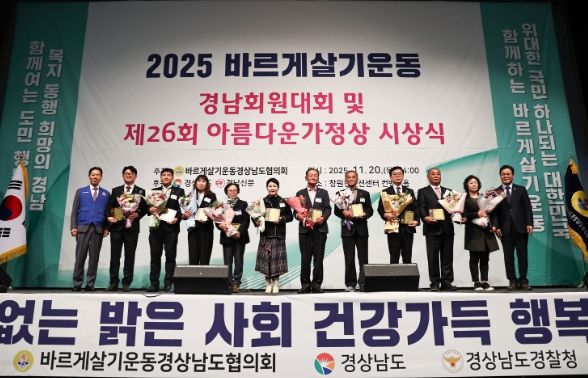 [ 중앙뉴스미디어 ] 경상남도가 20일 창원컨벤션센터에서 열린 ‘2025 바르게살기운동 경남 회원대회 및 제26회 아름다운 가정상 시상식’에서 지역사회 봉사에 앞장서 온 회원들을 격려했다.