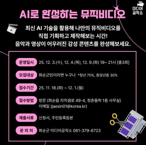 [ 중앙뉴스미디어 ] 화순군은 오는 12월 3일부터 화순군민을 대상으로 화순군 청년센터(청춘들락) 미디어공작소에서 ‘AI로 완성하는 뮤직비디오 영상 제작하기’ 교육을 진행한다고 밝혔다.