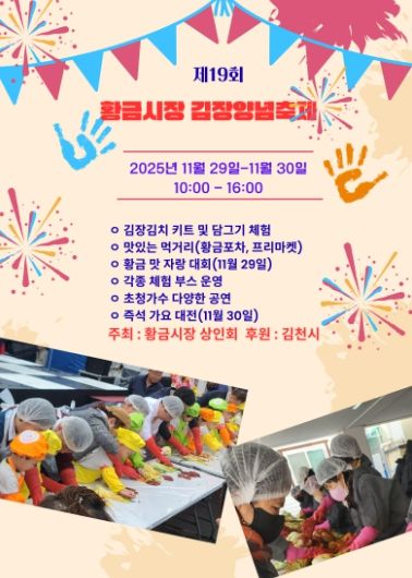 [ 중앙뉴스미디어 ] 김천시에서는 오는 29일~30일 황금동 한신로 일원에서 ‘제19회 황금시장 김장양념축제’를 개최한다고 밝혔다.