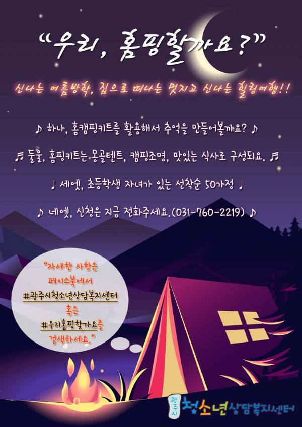 자세한 내용은 페이스북에 업로드된 ‘#광주시청소년상담복지센터 #우리홈핑할까요?’를 참조하면 된다.