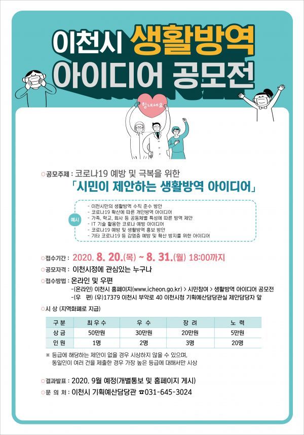 엄태준 이천시장은 “아이디어 공모전을 통해 생활방역 동참과 방역수칙 준수 등에 대한 시민들의 관심을 유도해 일상이 된 코로나19로부터 안전한 일상생활을 유지하고자 이번 공모전을 계획하게 됐다”며 “시민들의 다양한 의견이 반영될 수 있도록 많은 관심과 참여를 부탁드린다”고 말했다.