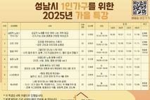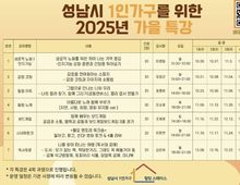 [ 중앙뉴스미디어 ] 성남시는 오는 10월 20일부터 12월 29일까지 중원구 하대원동 1인 가구 힐링스페이스에서 총 150명이 참여하는 7개 과목(과목별 20~30명)의 특강을 연다. 이번 특강은 문화·정서·예술 등의 분야에서 1인 가구의 자기 계발 역량을 높이고, 사회적 관계망 확대를 지원하기 위해 마련된다. 운영 과목은 △인지기능 유지 등 성공적 노화 △감정 코칭 △힐링 아트 △힐링 노래 △보드게임 △시네마 토크 △독서토론 등이다. 과목별 전문 강사를 초빙해 각각 4회 과정으로 특강을 진행한다. 성남시 거주 1인 가구면 누구나 참여할 수 있다. 참여 신청은 성남시 평생학습 통합플랫폼 ‘배움숲’이나 전화, 방문 등 다양한 방법으로 할 수 있다. 과목별 선착순 접수하며, 수강료는 무료다. 단, 재료비는 자부담이다. 성남시 힐링스페이스는 지난 2023년 7월 18일 전국 첫 직영 체제로 설치된 1인 가구 지원시설이다. 성남지역 38만3004가구의 35.1%를 차지하는 1인 가구(13만4409가구)를 정책적으로 지원하는 역할을 한다. 이번