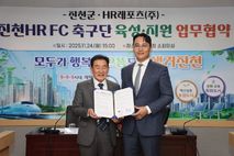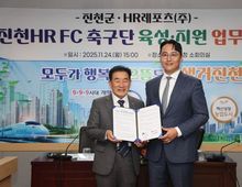 [ 중앙뉴스미디어 ] 충북 진천군은 군청 소회의실에서 HR레포츠 주식회사(대표 신호룡)와 ‘진천 HR FC 축구단 육성 및 지원을 위한 업무협약’을 체결했다고 24일 밝혔다. 이번 협약은 2026년 대한축구협회 K4 리그 참가를 앞두고, 진천 HR FC의 안정적인 운영 기반을 마련하고, 지역 스포츠 발전을 위한 협력 체계를 구축하기 위해 추진됐다. 협약식에는 송기섭 진천군수와 HR레포츠(주) 신호룡 대표, 김화영 진천군 체육회장, 김중기 진천군 축구협회장 등 관계자들이 참석했다. 협약의 주요 내용은 △축구단 운영과 발전 지원 △유소년 축구 육성과 저변 확대 △지역사회 공헌 활동 △스포츠마케팅을 통한 지역 홍보 강화 등이다. 군은 이번 협약을 통해 지역 스포츠 브랜드 가치 제고, 군민 스포츠 관람 문화 정착, 유소년·생활 체육 연계 강화 등 다양한 효과를 기대하고 있다. 앞으로 군은 행정적·재정적 지원과 경기장 관련 시설 활용 지원 등에 협력하고, HR 레포츠는 선수단 운영, 스포츠마케팅, 유소년 프로그램 운영 등을 총괄하며 지역 축구 문화 확산에 힘쓸 예정이다. 송기섭