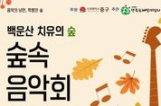 [ 중앙뉴스미디어 ] 인천시 중구는 문화와 나들이의 계절 가을을 맞이해 오는 11월 1일 오후 2시부터 백운산 치유의 숲(운남동 산120-1)에서 ‘백운산 치유의 숲 숲속음악회’를 개최한다. 이번 음악회는 인천 중구가 ‘2025년 산림치유 프로그램 운영 사업’의 일환으로 올해 처음 선보이는 행사다. 특히 숲속에서 ‘음악회’와 ‘전문 산림치유 프로그램’을 함께 즐길 수 있는 것이 특징이다. 행사에서는 스카이드림기타앙상블, 아리솔 우쿨렐레 앙상블, 송월장로교회 브라스코이노니아, 경기도 무형유산 제38호 풀피리 이수자의 무대 등 다양한 단체의 재능기부로 진행된 음악 문화 공연이 펼쳐질 예정이다. 또한, 문화 공연 사이사이마다 온몸 스트레칭, 명상, 건강 박수 등 전문 산림치유지도사와 함께하는 다채로운 ‘힐링·건강 프로그램’이 준비돼 있어 축제를 더욱 풍성하게 만들 전망이다. 행사를 주최한 한국숲해설가협회 관계자들은 “첫 축제이니만큼, 많은 시민이 함께해 주셨으면 좋겠다”라며 “산림치유 프로그램에도 시민들의 많은 관심과 참여를 바란다”라고 전했다. 한편, 인천 중구 운남동 산12