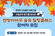 [ 중앙뉴스미디어 ] 파주보건소는 시민들의 건강한 삶을 위한 한의약 건강 증진 프로그램인 ‘한방이어락(樂) 숲속 치유교실(힐링 클래스)’을 오는 25일 10시부터 12시까지 율곡수목원에서 운영한다. 이번 프로그램은 자연 속에서 가족이 함께 건강을 되돌아보고, 숲에서의 명상과 호흡을 통해 스트레스를 해소하고자 기획됐다. 참가자들은 수목원의 맑은 공기와 아름다운 풍경 속에서 지친 몸과 마음을 회복하는 시간을 갖게 된다. 주요 내용은 ▲구절초 숲길 산책 ▲자연 속에서 가족과 추억 만들기 ▲구절초 차 마시기 등 구절초를 주제로 한 다양한 활동으로 구성되어 있다. 신청은 파주시 평생교육포털 누리집(lll.paju.go.kr)을 통해 가능하며, 가족 단위로(4~6가구, 총 20여 명) 선착순 모집한다. 단, 신청 가구가 많을 경우 3대 가족을 우선 선발한다. 이한상 파주보건소장은 “자연과 함께하는 치유 프로그램을 통해 가족 간 유대감을 높이고, 건강한 생활 습관을 기를 수 있는 계기가 되길 바란다”라며 “많은 시민들의 적극적인 참여를 기대한다”라고 밝혔다.