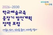 [ 중앙뉴스미디어 ] 서울특별시교육청은 ‘예술로 잇다, 감성을 품다, 미래를 열다’를 주제로 10월 30일, 제2서울창의예술교육센터에서 『2026~2030 학교예술교육 중장기 발전계획 비전 선포식』을 개최한다. 선포식은 ‘AI 아트랩 서울’건립을 통해 미래형 예술교육의 새 장을 여는 서울시교육청의 비전을 공유하는 자리로, 예술교육 분야 교수 및 전문가, 학생, 학부모, 초‧중‧고‧특수 교원 등 200여 명이 참석할 예정이다. 서울시교육청 2026~2030 학교예술교육 중장기 발전계획은 ‘예술이 일상이 되는 학교’를 비전으로 제시하고, △'미래역량 기반 학교예술교육' △'마음을 채우는 서울예술교육' △'지역과 상생하는 예술생태계'의 세 가지 추진 전략을 통해 서울 학교예술교육의 발전 방향을 구체화했다. 이번 계획은 예술이 학생의 마음 성장을 돕는 교육적 힘이 되도록, 음악·미술·연극·영화·뮤지컬 등 다양한 예술교육 경험을 통해 정서적으로 어려움을 겪는 학생도 예술로 마음을 채우고 성장할 수 있도록 지원하는데 중점을 두고 있다. 나아가 모든 학생이 예술을 누리며 일상에서 직접 예술을 경험할 수 있게 하는 것을 학