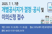 [ 중앙뉴스미디어 ] 수원시 권선구는 다가오는 30일에 개별공시지가를 결정·공시하고 10월 30일부터 11월 28일까지 이의신청을 받는다. 이번에 공시되는 개별공시지가 대상 토지는 지난 1월 1일부터 6월 30일까지 토지이동(분할, 합병, 지목변경 등)이 발생한 599필지이고, 감정평가사의 검증과 수원시 부동산가격공시위원회 심의를 통해 결정됐다. 지가열람은 권선구청 토지관리과 및 관할 행정복지센터에서 가능하며, 온라인 열람은 부동산공시가격알리미 홈페이지에서 가능하다. 결정지가에 대해 이의가 있는 토지소유자 및 이해관계인은 11월 28일까지 이의신청서를 권선구청 토지관리과 및 관할 행정복지센터 또는 부동산공시가격알리미 홈페이지에 제출할 수 있다. 이의신청된 필지는 토지특성을 재확인하고 인근 지가와의 균형 등을 고려하여 면밀하게 재조사하며, 감정평가사 검증과 수원시 부동산가격공시위원회 심의를 거쳐 12월 22일에 최종 결정된다.