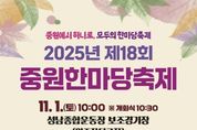 [ 중앙뉴스미디어 ] ‘제18회 중원한마당축제’가 오는 11월 1일 오전 10시부터 오후 2시 30분까지 2000여 명이 참석한 가운데 성남종합운동장 보조경기장에서 열린다. 성남시 중원구가 후원하고, 중원한마당축제 추진위원회가 주최·주관해 열리는 이번 행사는 ‘중원에서 하나로, 모두의 한마당 축제’를 주제로 진행된다. 이날 특설무대에선 11개 동 주민 대표가 출연해 넘치는 끼와 노래 실력을 선보이는 ‘우리 동네 인기스타’ 공연이 펼쳐진다. 초청 가수 윤수현의 ‘천태만상’ 등 트로트 공연, 신인 아이돌 걸그룹 아스텔의 ‘슈퍼노바’, ‘아일랜드’ 등의 공연, 중원유스센터 청소년 보컬 동아리와 댄스 동아리 공연도 열려 축제 분위기를 달군다. 시민 체험 행사도 다양하다. 행사장 곳곳에 총 11개 체험 부스를 설치해 4차산업과 관련한 드론 축구, 가상현실(VR) 트럭 체험, 배틀 로봇 등과 페이스페인팅, 목공 체험 등을 해볼 수 있다. 중원구 관계자는 “주민 간 화합을 도모하고, 신나고 활기찬 지역 분위기를 조성하는 장이 될 것”이라고 말했다.