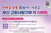 [ 중앙뉴스미디어 ] 부산시는 오늘(16일)부터 12월 31일까지 77일간, 고향사랑기부제 참여 확산을 위해 '역대급 경품 대발사 시즌2! 부산 고향사랑기부제 연말 빅 이벤트'를 개최한다고 밝혔다. 지난 5월 진행된 ‘역대급 경품 대발사’ 이벤트는 해운대 5성급 호텔 숙박권을 포함한 푸짐한 경품으로 많은 시민들의 뜨거운 관심과 참여 속에 성황리에 마무리됐다. 이번 시즌2 이벤트는 그 성원에 힘입어 더욱 풍성한 혜택과 경품으로 시민들을 다시 한번 찾아온다. 특히, 올해 10월 17일부터 부산에서 개최되는 제106회 전국체육대회와 연계해 이번 이벤트를 가을부터 연말까지 이어가며, 시민들에게 다채로운 혜택과 즐거움을 제공할 계획이다. 이와 함께 시는 전국체전 기간(10.17.~10.23.)과 전국장애인체전 기간(10.31.~11.5.)에 ‘고향사랑기부제 홍보 공간(부스)’을 운영해 현장 방문객들에게 기부제 취지와 참여 방법을 적극 알릴 예정이다. 또한 이벤트 기간 중 시청에 1회 10만 원 이상 기부한 기부자에게 기본혜택 2가지와 함께 특별한 추가 경품 4가지를 증정한다. [기본