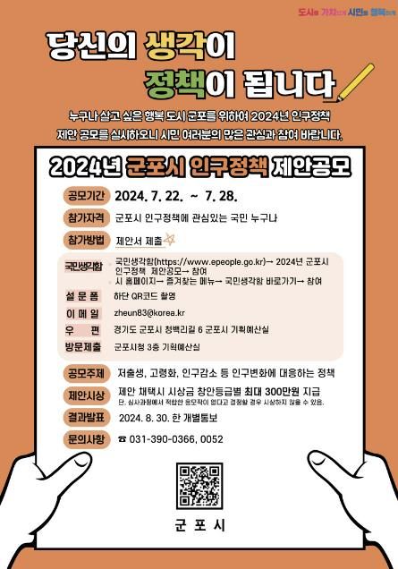 하은호 시장은 “정부가 인구 국가비상사태를 선언할 만큼 인구문제는 미래세대가 감내하기 어려운 커다란 부담이 될 것이다”라며 “이번 인구정책 제안 공모전이 위기에 대응하고 누구나 살고 싶은 행복도시 군포를 만드는데 도움이 될 수 있도록 시민 여러분의 많은 참여를 부탁드린다”라고 말했다.