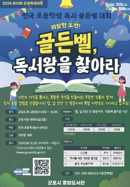 이번 대회는 전국 초등 4~6학년 학생을 대상으로 진행되며, 독서에 대한 흥미를 고취하고, 독서 능력 향상을 목표로 한다. 참가 신청은 8월 10일부터 군포시도서관 홈페이지에서 온라인 접수로 진행하며, 신청 완료된 학생들은 오는 9월 28일 군포시청 대회의실에서 열리는 본선에 참가하게 된다.