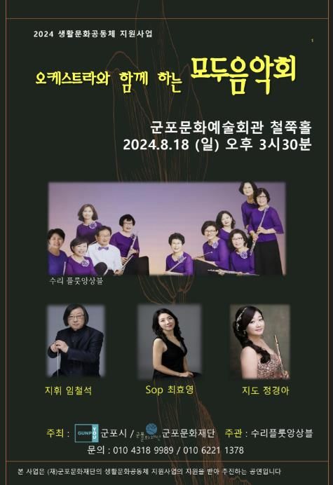 또한 이번 음악회는 지역의 문화소외계층과 시민을 대상으로 준비한 무료 공연으로 군포시민은 누구나 자유롭게 관람할 수 있으며, 플릇과 오케스트라의 조화로운 협연을 통해 다채로운 음악적 매력을 경험할 수 있다.