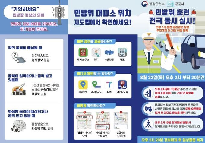 [ 중앙뉴스미디어 ] 군포시는 오는 8월 22일 14:00부터 20분간 ‘2024년 을지연습 연계 공습대비 민방위훈련’을 실시한다.
