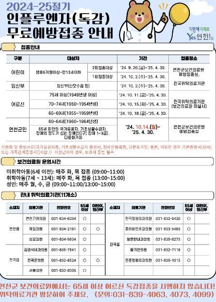 군에서 접종을 지원하는 대상자는 연천군민 중 60~64세(1960~1964년 출생자), 장애인, 기초생활수급자, 다문화 가정, 국가유공자다. 증빙서류를 지참하여 10월 14일부터 백신 소진 시까지 보건의료원 예방접종실(접종시간: 월, 수, 금 09:00~11:00, 13:00~15:00)에서 접종받으면 된다.