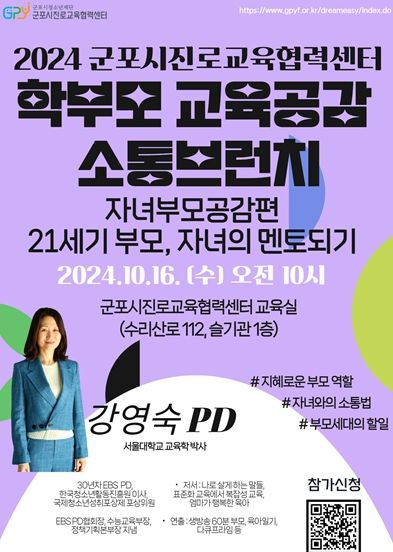 [ 중앙뉴스미디어 ] 군포시진로교육협력센터에서는 "21세기 부모, 자녀의 멘토 되기"를 주제로 학부모 교육공감 소통브런치(자녀부모공감편)가 2024년 10월 16일 오전 10시 진행된다.