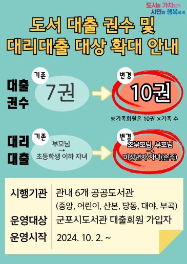 기존 군포시 도서관 관외대출은 1인당 최대 7권씩 가능했으나 이번 개정으로 대출 권수가 확대되어 1인당 최대 10권씩 대출할 수 있다. 가족회원도 마찬가지로 가족 명수×7권이던 대출 권수가 가족 명수×10권으로 확대될 예정이다.
