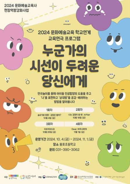 [ 중앙뉴스미디어 ] 군포문화재단 군포시평생학습원은 이달 4일부터 11월 1일까지 용호초등학교 3학년 전체학생들을 대상으로 학교연계 교육연극 ‘누군가의 시선이 두려운 당신에게’를 진행한다.