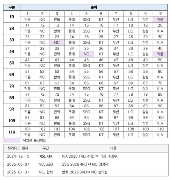 KBO 규약에 따라 2026 신인 지명권이 선수와 트레이드 된 사례는 3차례, 총 4개의 지명권 이동이 있었다. NC는 한화와 SSG로부터 각각 양수 받은 3, 4라운드 지명권을, 키움은 KIA로부터 양수 받은 1, 4라운드 지명권을 갖는다. 따라서 전 구단이 모든 지명권을 행사할 경우, 키움과 NC는 13명, 한화와 SSG는 10명, KIA는 9명, 이외 구단들은 11명의 선수를 지명하게 돼, 총 110명의 선수가 KBO 리그 구단 유니폼을 입게 된다.