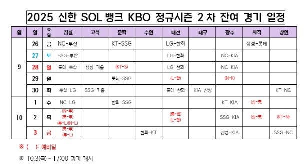 [ 중앙뉴스미디어 ] KBO는 26일(금) 2025 신한 SOL뱅크 KBO 정규시즌 2차 잔여 경기 일정을 확정했다.