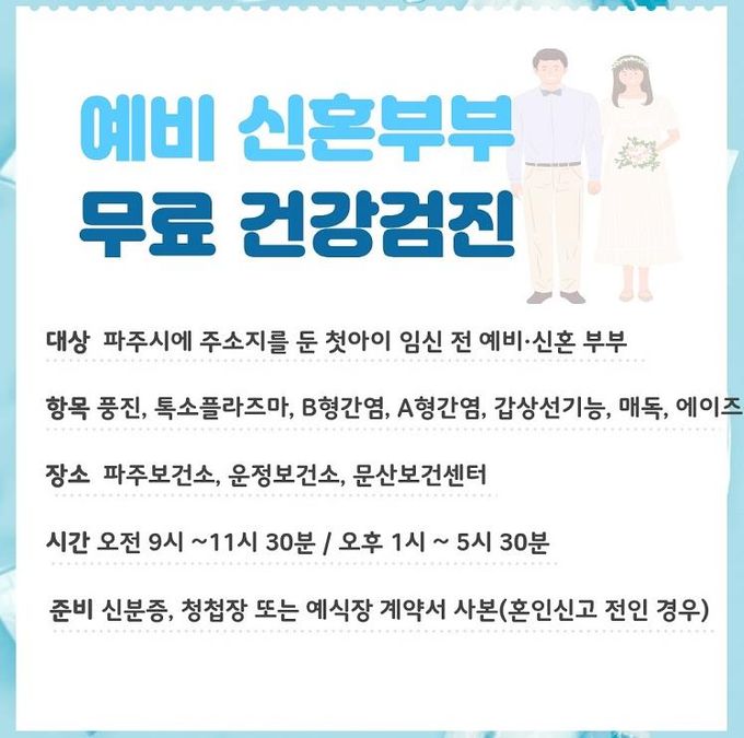검사 대상은 파주시에 거주하는 예비·신혼부부이며, 풍진, 톡소플라즈마, B형간염, A형간염, 갑상선기능, 매독, 에이즈 등 총 7종 검사를 무료 제공한다.