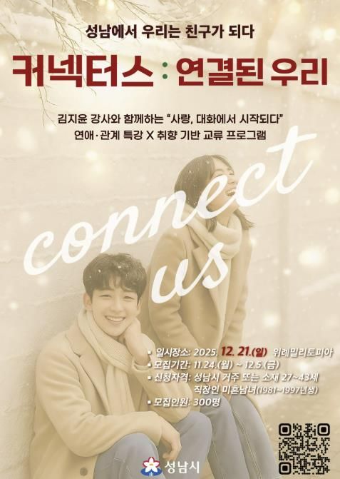 [ 중앙뉴스미디어 ] 성남시는 새로운 친구를 만들 수 있는 청년 교류 행사 ‘커넥터스(Connect-us) 연결된 우리’ 참가 희망자 300명을 오는 12월 5일까지 모집한다.