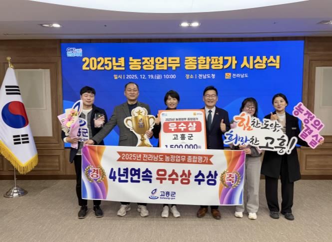 [ 중앙뉴스미디어 ] 고흥군이 전라남도가 주관한 ‘2025년 농정업무 종합평가’에서 4년 연속 ‘우수상’을 수상하며, 농업 강군(强郡)으로서의 위상을 다시 한번 입증했다.