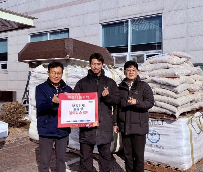 정창업 양동면장은 “겨울철을 앞두고 어려운 이웃과 주민 안전을 위해 제설 자재를 기탁해 주신 양동건재 류용상 씨께 깊이 감사드린다”며 “기탁해 주신 염화칼슘은 꼭 필요한 곳에 소중히 사용하겠다”고 전했다.