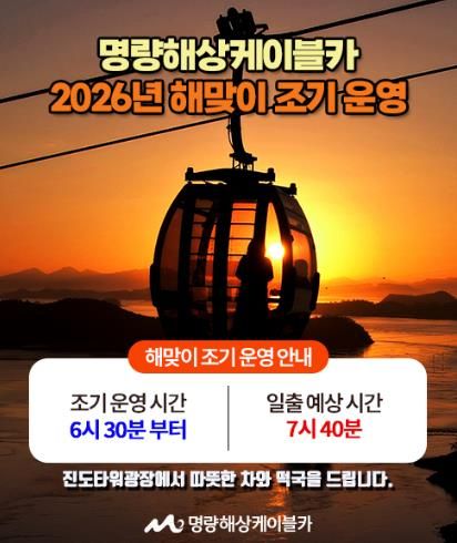 전남 해남, 진도지역의 대표 관광지인 명량해상케이블카는 2026년 1월 1일 새해 해맞이를 위해 평소보다 이른 오전 6시 30분부터 케이블카 조기 운영에 나선다.