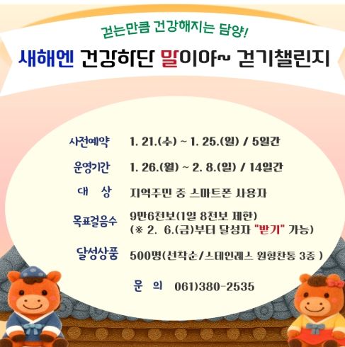 [ 중앙뉴스미디어 ] 담양군은 2026년 새해를 맞아 오는 1월 26일부터 2월 8일까지 온라인 걷기 챌린지 ‘새해엔 건강하단 말이야’를 운영한다고 밝혔다.