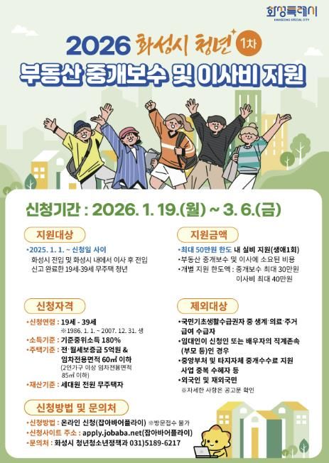 [ 중앙뉴스미디어 ] 화성특례시가 19일부터 3월 6일까지 청년들의 주거비 부담 경감 및 정주 여건 향상을 위한 ‘2026년 상반기 청년 부동산 중개보수 및 이사비 지원사업’ 신청을 받는다.