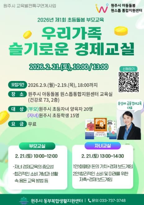 [ 중앙뉴스미디어 ] 원주시 아동돌봄 원스톱통합지원센터는 2월 21일 초등생 가족을 위한 무료 경제 교육인'우리 가족 슬기로운 경제 교실'을 운영한다.