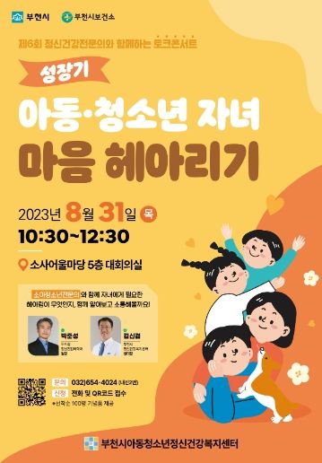 부천시에서 주최하고, 부천시아동청소년정신건강복지센터가 주관하는 ‘제6회 정신건강전문의와 함께하는 토크콘서트’는 '성장기 아동·청소년 자녀 마음 헤아리기'를 주제로 부천시민 누구나 참여할 수 있다.