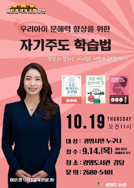 [ 중앙뉴스미디어 ] 광명시 광명도서관은 오는 10월 19일 오전 11시 도서관 강당에서 ‘우리아이 문해력 향상을 위한 자기주도 학습법’을 주제로 아카데미 특별강연회를 개최한다.