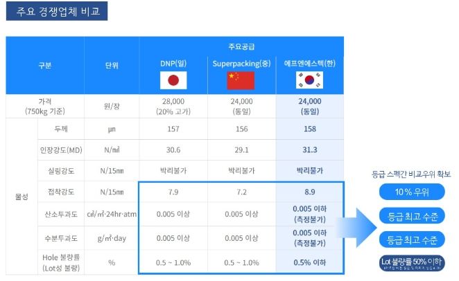 ▶에프엔에스텍 기업은 이차전지 양극재용 수분차단 파우치 전문기업으로 고기능성, 고부가 파우치 필름 국산화에 노력하는 업체로 이차전지용 복합필름 개발을 위한 핵심기술과 많은 전문인력을 보유하고 있다. 양극재용 수분차단 복합필름 파우치와 같은 필름은 일본 DNP社 와 중국 superpacking 社로부터 전량 수입해 사용 중이다. 타사 제품과의 가격 경쟁력과 국내 수요기업의 다양화가 많은 만큼 제품 개발성공 시 기존의 수입 대체품으로 국산화가 가능한 계기가 마련될 것으로 기대한다.