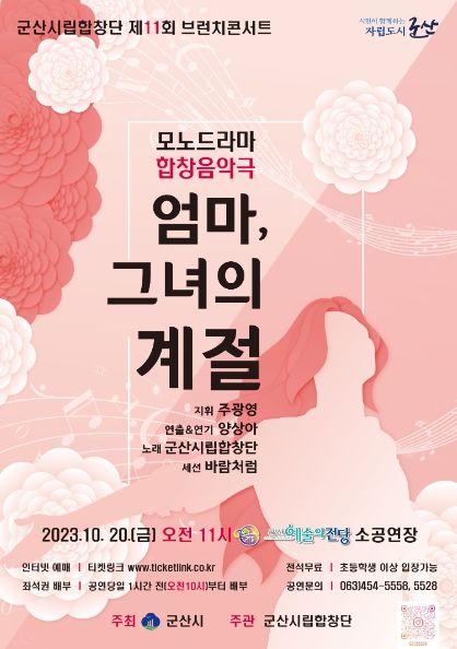군산시립합창단이 제11회 브런치 콘서트'엄마, 그녀의 계절'를 오는 20일 오전 11시, 군산예술의전당 소공연장에서 실시한다.