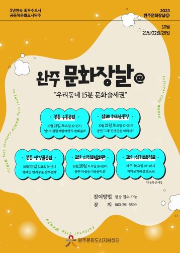 완주문화도시지원센터는 멀리 가지 않고도 만날 수 있는 동네·마을 단위 문화장소 조성, 이른바 15분 문화슬세권을 만들어 나가고자 ‘완주문화장날@’ 사업을 추진 중이다. 특히 기획부터 실행까지 문화현장주민기획단이 주인이자 주체인 사업으로 의미가 더욱 크다.