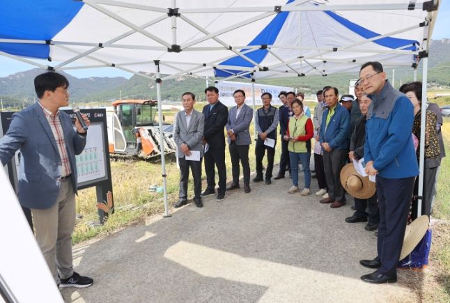 군은 18일 농림축산식품부 공모사업으로 선정된‘저탄소 벼 논물관리 기술보급 시범사업’사업대상지인 계곡면 방춘리 일원에서 벼수확과 함께 현장 설명회를 개최했다.
