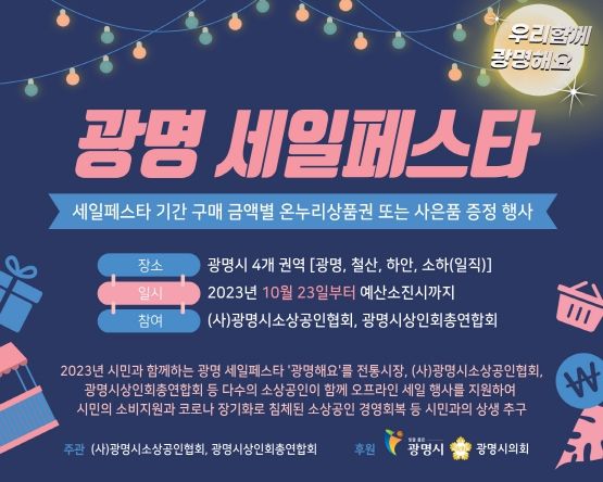 코로나19 엔데믹 선언 이후 처음으로 개최되는 광명세일페스타는 경기침체 장기화와 재개발·재건축 등으로 어려움을 겪고 있는 골목상권과 소상공인의 경영 회복을 위해 소비 분위기를 조성하고 위축된 지역경제를 활성화하고자 추진된다.