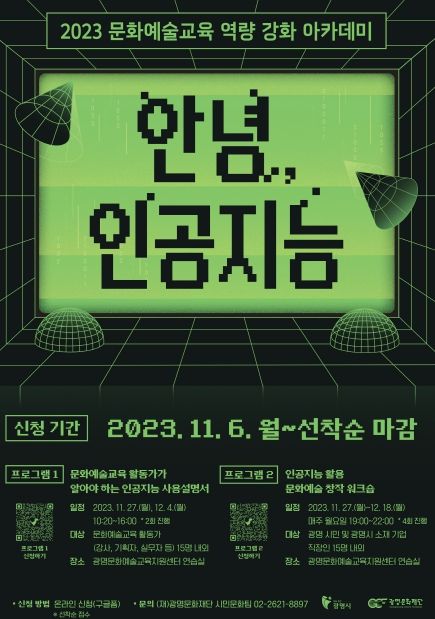 [ 중앙뉴스미디어 ] (재)광명문화재단은 11월 6일부터 새로운 기술과 트렌드 제공을 위한 인공지능(AI) 활용 문화예술교육 역량 강화 아카데미 ‘안녕, 인공지능’ 사업 참가자 30명(프로그램별 15명)을 모집한다.